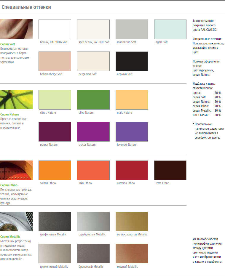 Изучая и выбирая цвет учитывайте, пожалуйста, что по техническим причинам невозможно абсолютно точно передать оттенок цвета через дисплей. Наши специалисты при консультации могут предоставить оригинальные образцы и помогут вам в выборе цветового исполнения радиаторов.