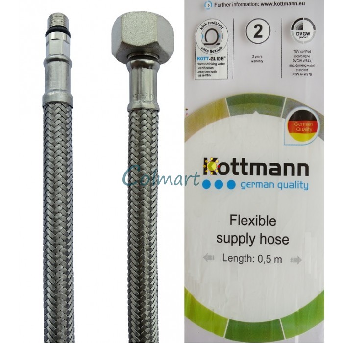 Гибкая подводка воды в нж оплетке производство Германия. Шланг в нержавеющей оплетке к смесителю Kottmann M10*1/2" 100 см с пластиковым шлангом внутри для подключения смесителя.