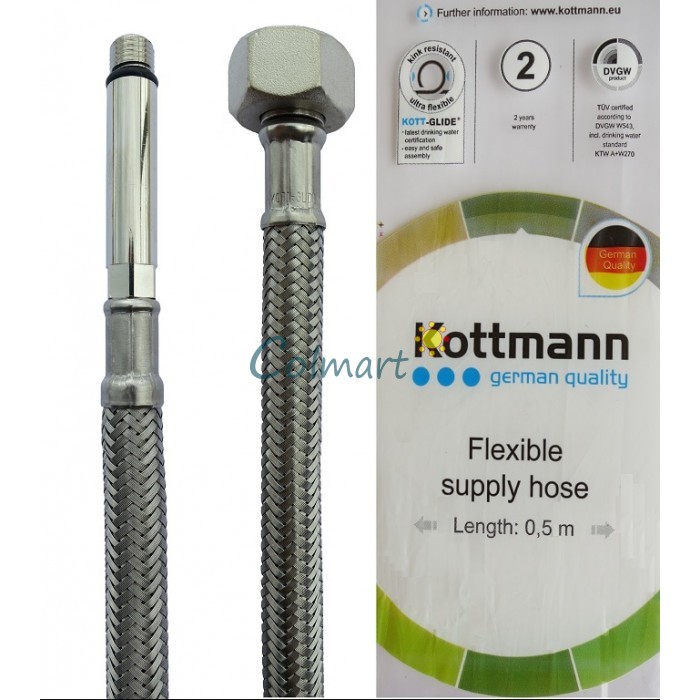 Гибкая подводка воды в нж оплетке производство Германия. Шланг в нержавеющей оплетке к смесителю Kottmann M10*1/2" 30 см с пластиковым шлангом внутри для подключения смесителя.